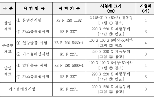 국토교통부 고시에 따른 난연성능시험을 의뢰하려면 아래 표를 읽어보시고 해당 급수에 맞도록 시험체를 준비하시면 됩니다.