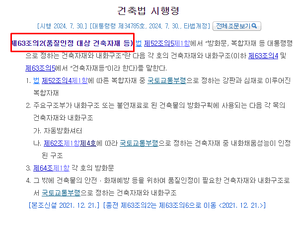 건축자재(방화문,복합자재(강판+심재(단열재)) ), 내화구조는 품질인정을 받아야 한다.