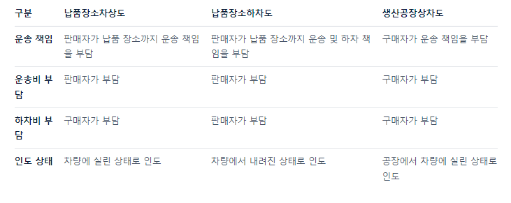 - 판매자: 물품을 납품 장소까지 운송하는 책임을 부담합니다.