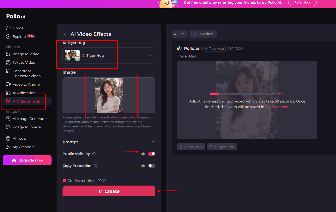 무료 플랜 : 20 크레딧 제공(약 2개의 영상 제작 가능).