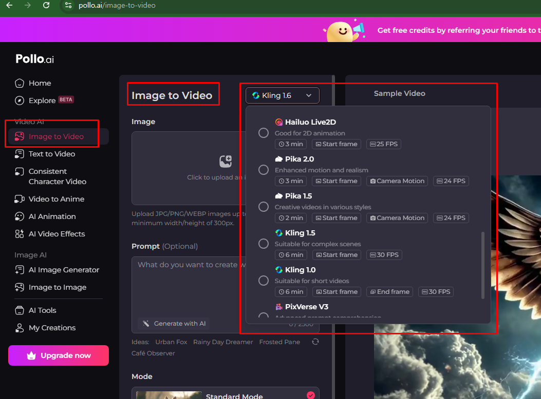 이미지 투 비디오 : 이미지를 업로드하고 원하는 AI 모델을 선택해 비디오를 생성.
