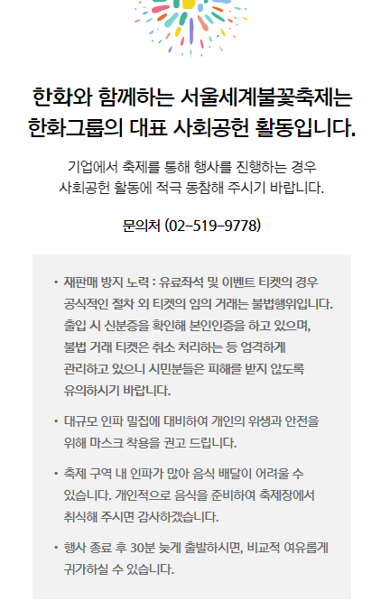 한화와 함께하는 서울세계불꽃축제가 10월5일(토) 여의도 한강공원에서 개최됩니다.