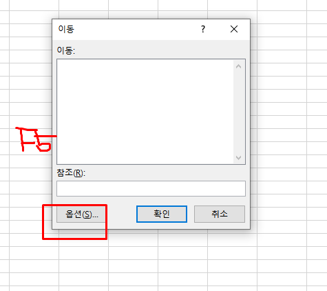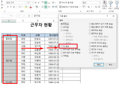 그리고 아래 사진처럼 '빈 셀'을 선택하고 확인을 눌러줍니다