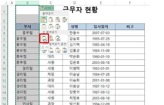 아직은 변화가 없습니다. 이제 붙여넣기를 했을 때 나오는 '옵션단추'에서 '값 붙여넣기'에 있는 첫번째 항목을 클릭합니다.