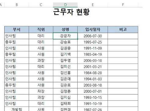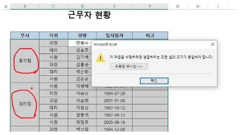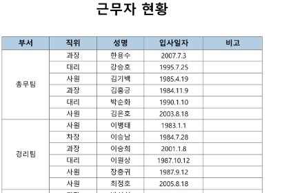 오늘은 병합된 셀이 있는 표를 쉽게 정렬하는 방법을 알아봅시다. 아래 근무자 현황 표가 있네요.
