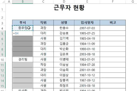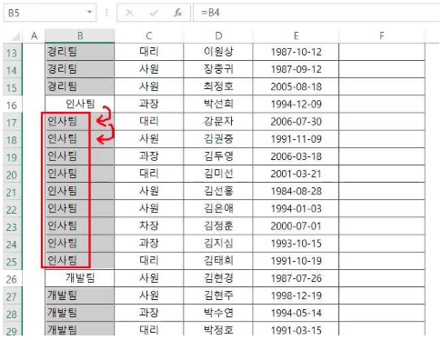 경리팀 아래쪽엔 모두 경리팀이, 인사팀 아래에는 모두 인사팀 이라고 잘 입력돼 있네요.