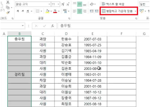 B열을 선택하고 맞춤 메뉴에 있는 '병합하고 가운데 맞춤'을 눌러줍니다.