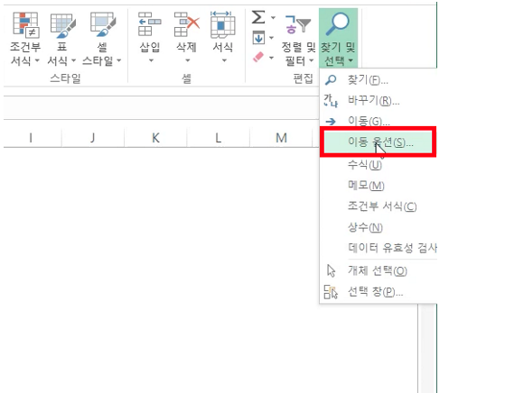 우선 병합돼있던 B 셀을 선택한뒤 '찾기 및 선택' 메뉴에서 '이동 옵션'을 클릭합니다.