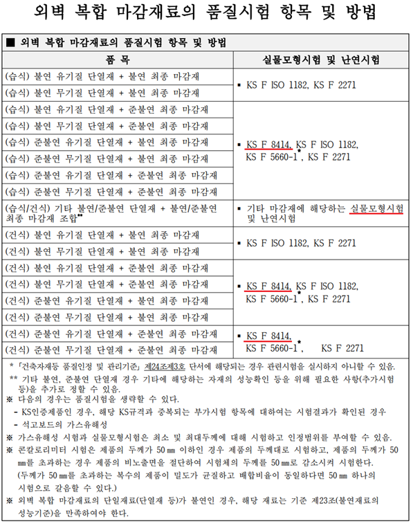 ※ 예) 페이싱 면재가 붙은 단열재(PF 등)는 면재와 단열재를 분리하여 각각 난연성능 시험에 적합해야 함