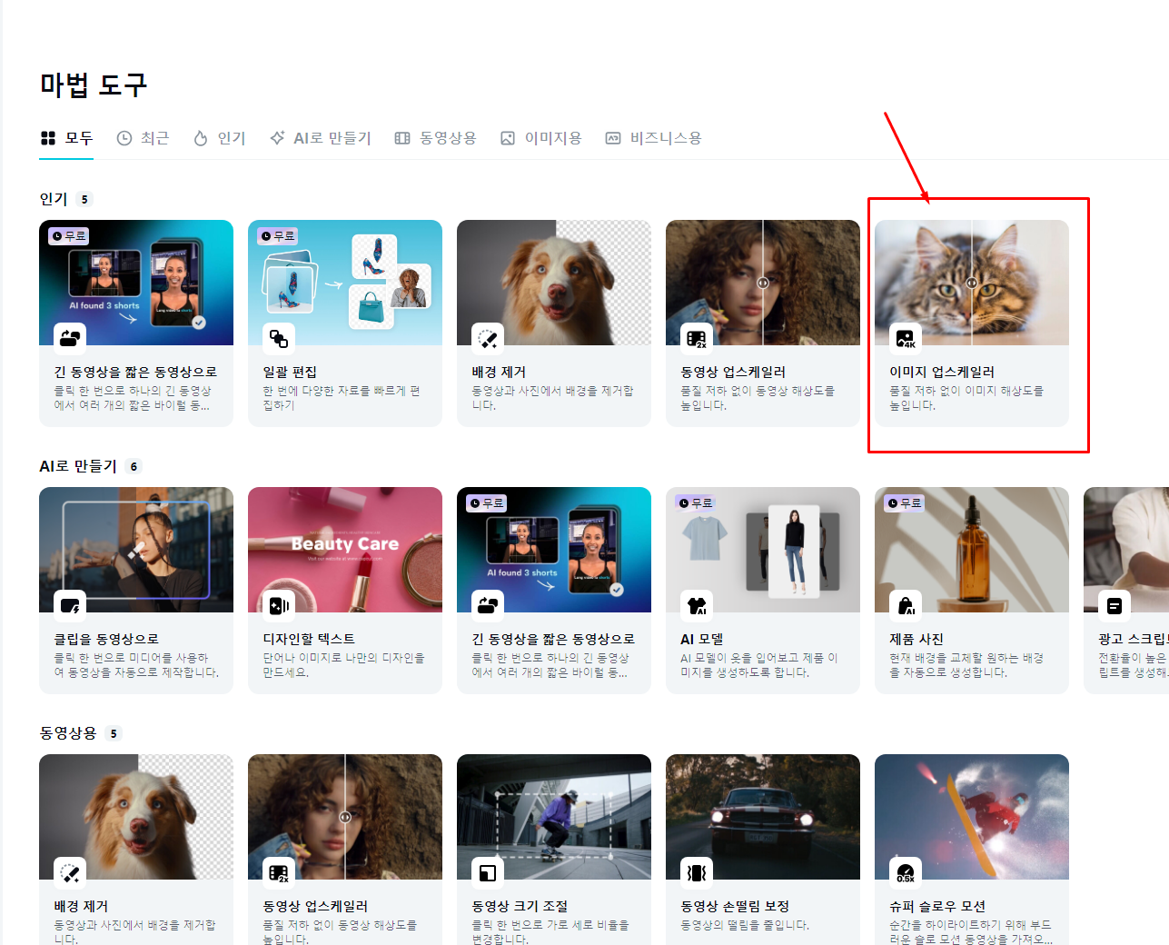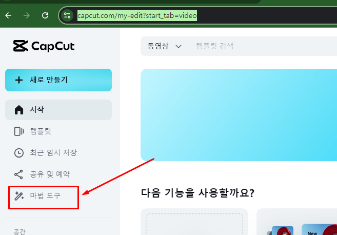 캡컷 PC 웹용 에서 로그인 후 마법도구 들어갑니다.