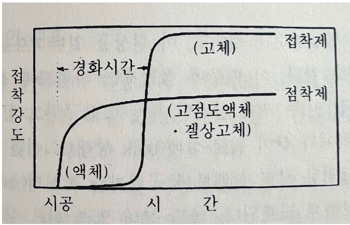 - 접착제란 넓은 의미에서 점착제를 포함하지만 접착 후 떼어내면 고화된 후의 고체 상태로 접착력이 완전히 사라진 상태를 유지함(재부착 불가능)