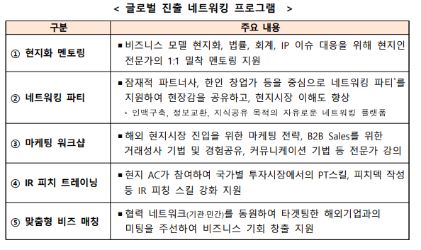- 국내외 투자자 및 해외 진출 전문가와의 네트워킹을 통해 투자유치와 해외시장 진출을 직접적으로 지원합니다.