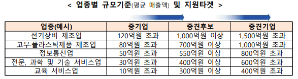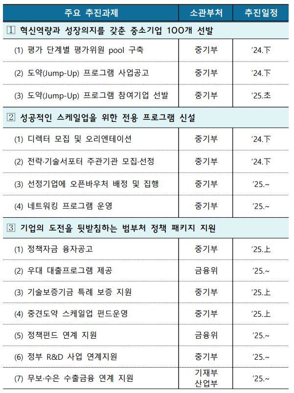 | 지원전략 | (전략 1) 혁신역량과 성장의지를 갖춘 중소기업 100개를 선발 (전략 2) 성공적 스케일업(Scale-Up)을 위한 전용 프로그램신설 (전략 3) 기업의 도전을 뒷받침하는 금융·수출·R&D 등 정책 패키지를 지원 |