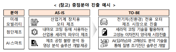 | 방향 | ![]() ◈ 중소기업의 스케일업을 이끌 중점분야를 중심으로 진출과 성장 촉진 ◈ 민간 역량을 기반으로 성장잠재력이 큰 유망기업 선발 ◈ 유망기업에 대한 과감한 정책 집중지원 으로 스케일업 달성 |