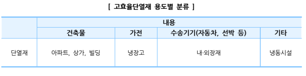 ▪아파트를 비롯한 대부분의 건축물과 대형 냉동 창고, 자동차, 냉장고 등에 필수적으로 사용됨 - 정부가 2030년까지 온실가스 배출전망치의 37%를 감축하기로 국제 사회에 공언하는 등 지속적으로 온실가스 감축과 지구 환경 개선 노력과 맞물려 에너지소비량이 많은 산업용시장에도 고효율 단열재 사용에 대한 수요가 크게 증가하고 있음