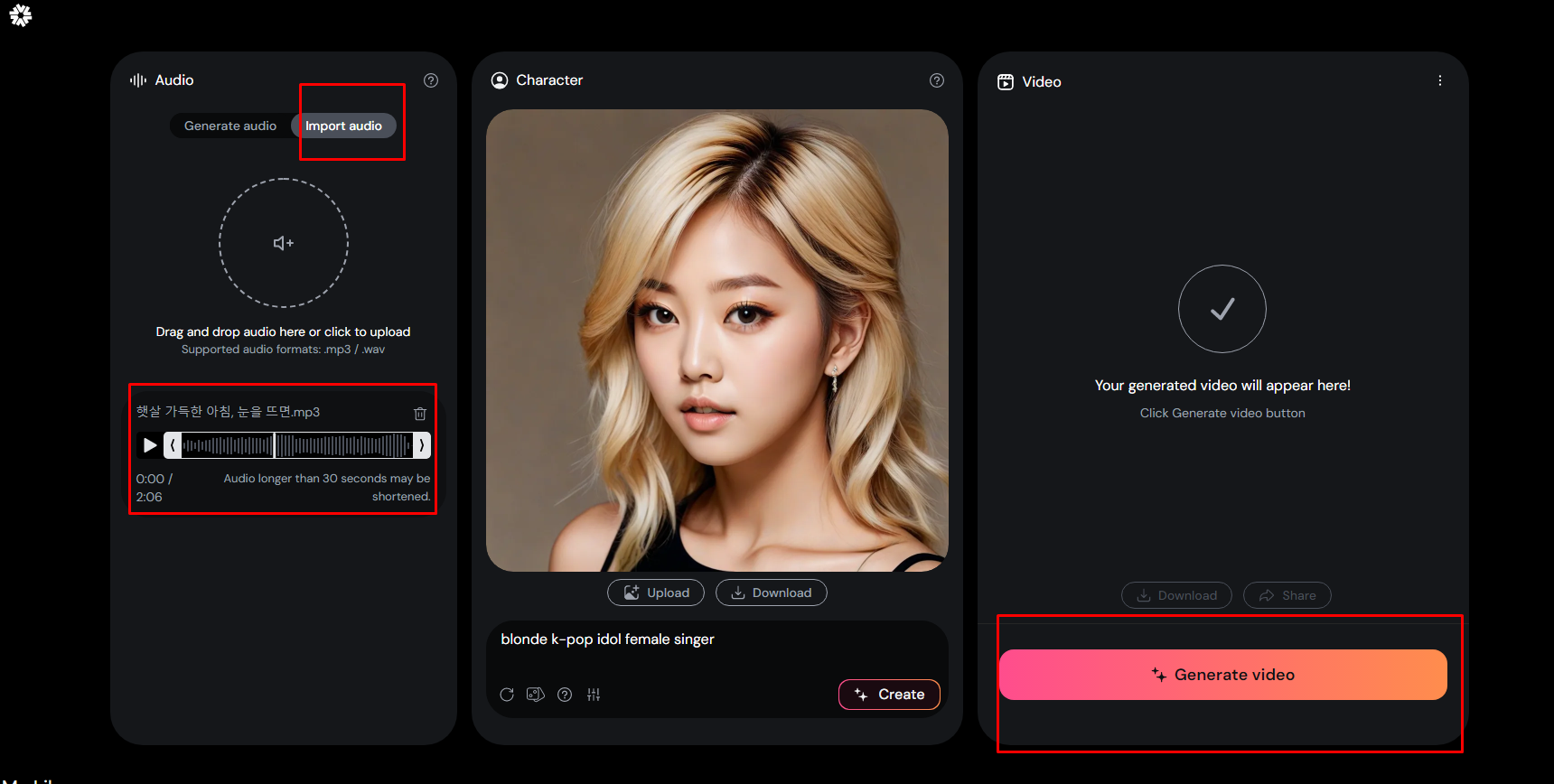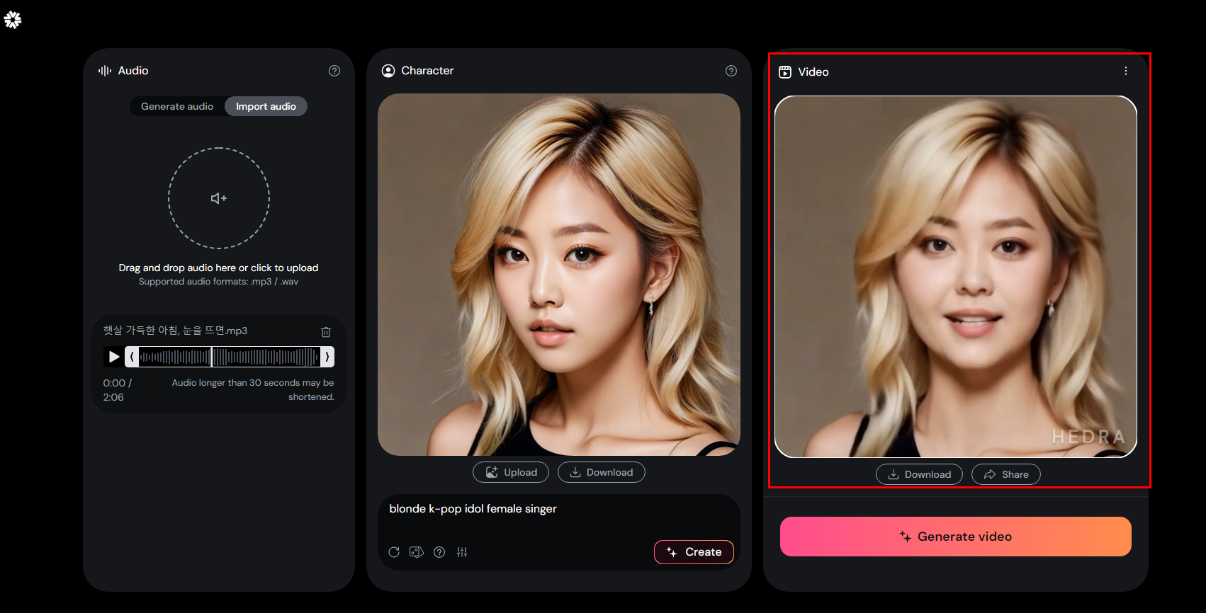 긴노래도 hedra는 6초이상 30초 미만으로 video 생성이 되요