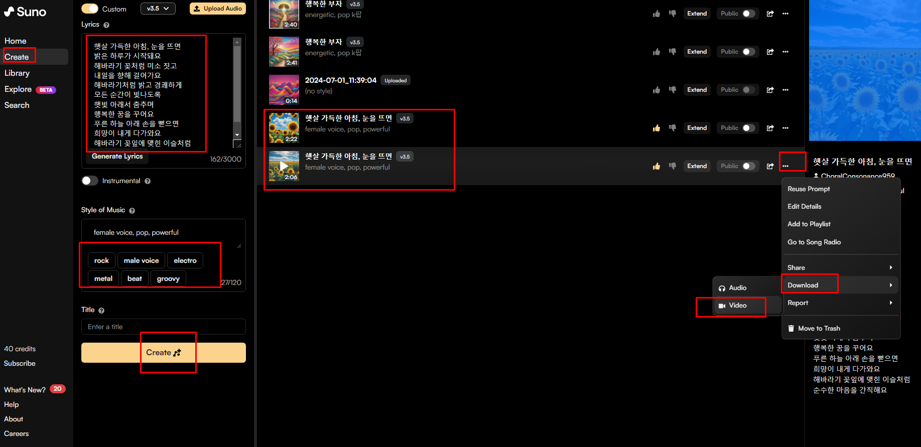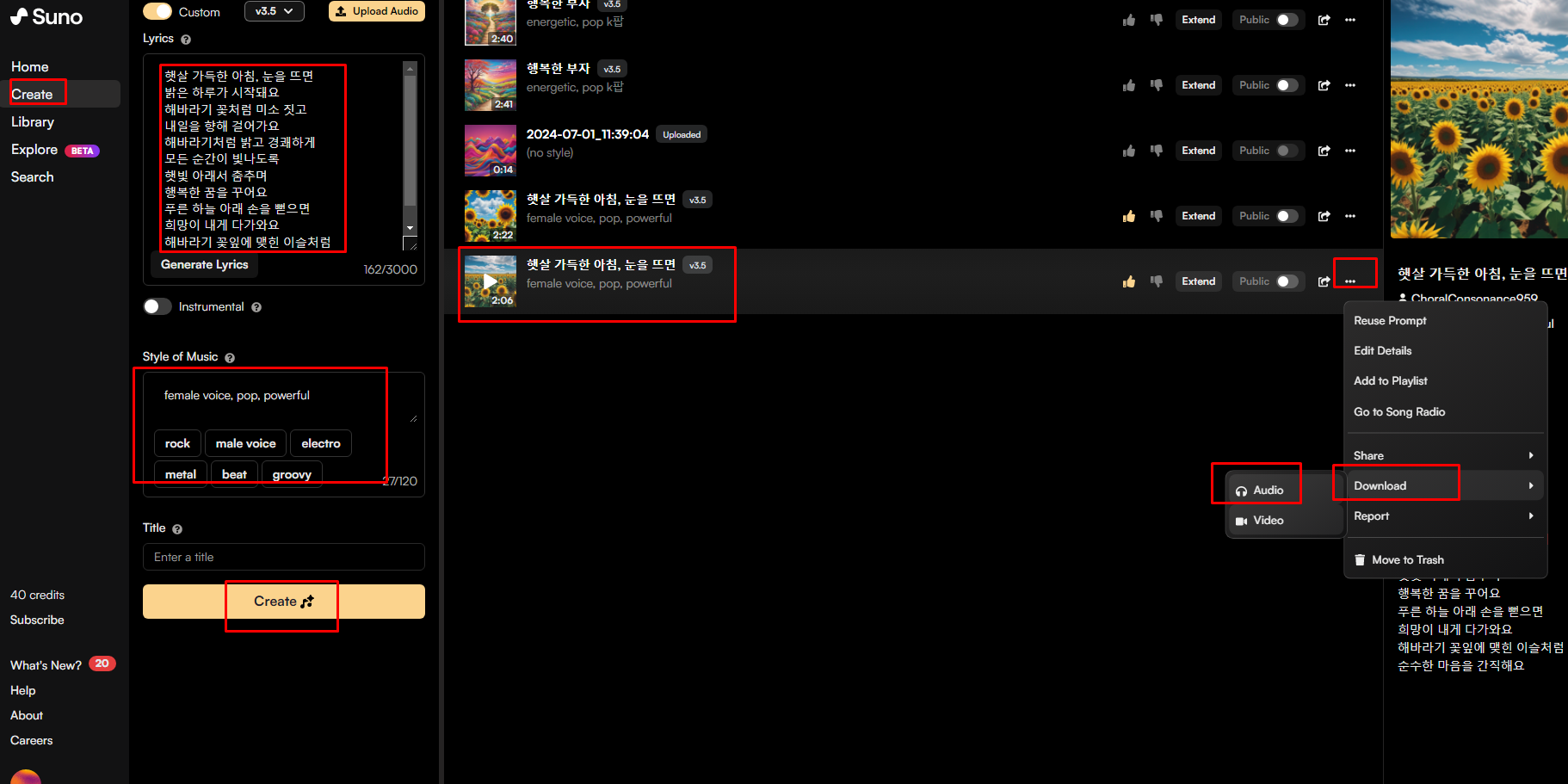 3.저는 언능 수노(suno)로 가서 음악 화일을 만들어 왔어요