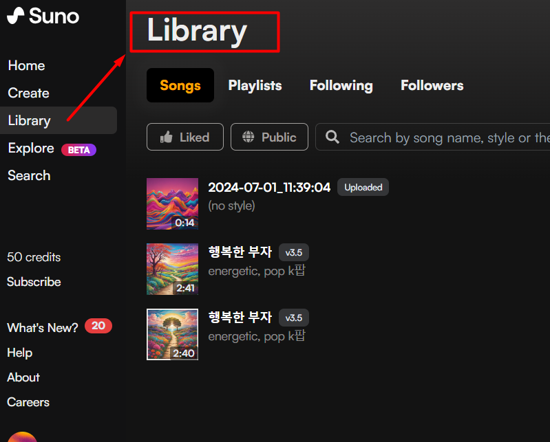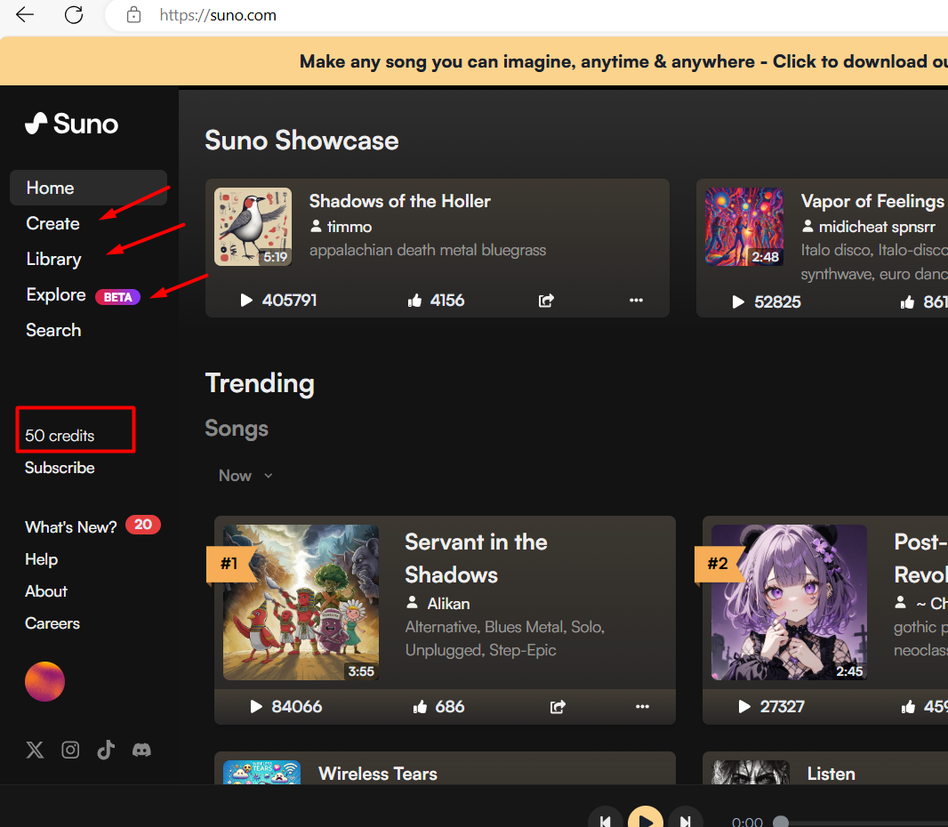 하루에 50 credits이 주어지는 데 10곡을 만들 수 있어요^^