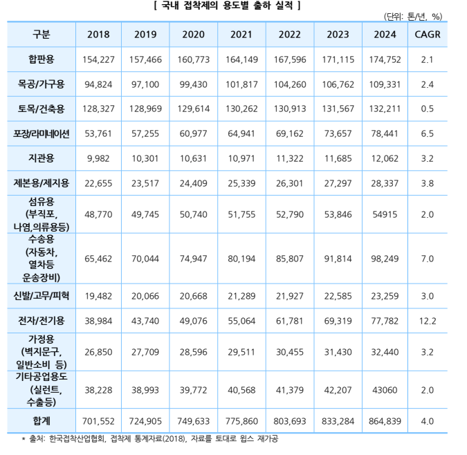 •   산업계에서  접착제의  용도도  자동차용,  라미네이트(laminate)용,  건축·시공용,  목가구  용, 전기·전자용, 유통용, 신발용, 항공기, 구조용 등 다양함.