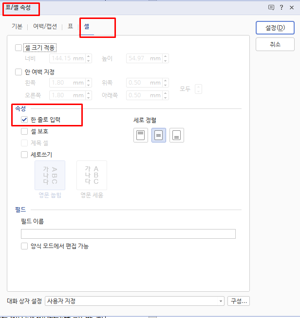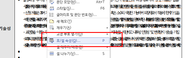 표에서 마우스 오른쪽 누르고 표/셀 속성을 찾습니다.