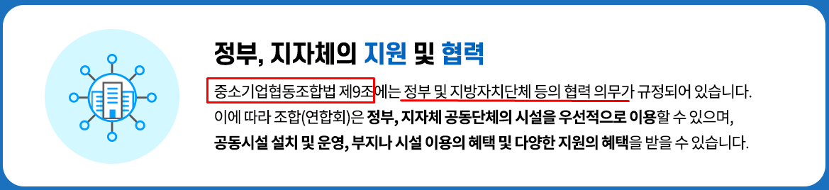 중소기업협동조합은 중소기업협동조합법(이하 ‘법’이라고 함)을 근거로 설립할 수 있는 비영리법인입니다.