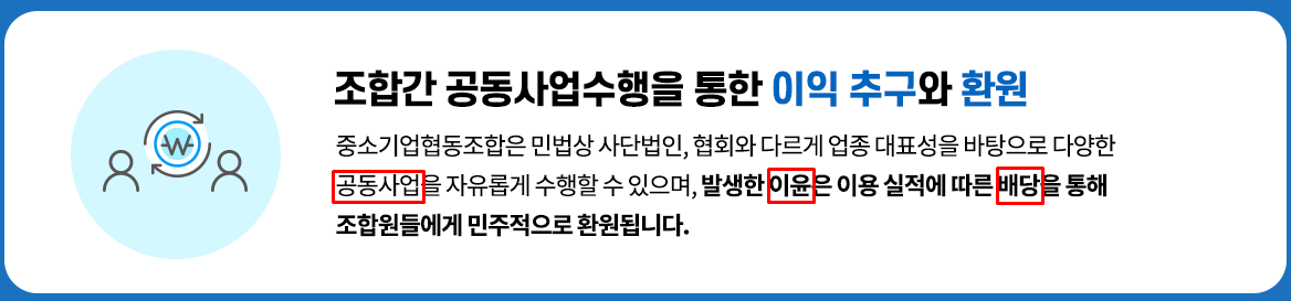 개별적으로는 한계가 있는 중소기업이 모여 협동사업(공동사업)을 통해 경제적 기회균등을 실현할 수 있습니다.