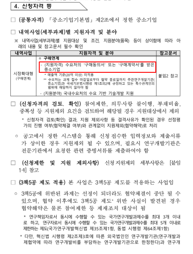 ※ 주관연구개발기관(중소기업)과 수요처는 과제 접수 마감일로부터 협약종료일까지 계열사 및 출자지분 관계가 없어야 하며, 국세기본법시행령 제1조의2에 규정하고 있는 특수관계인의 범위에 해당하지 않아야 함