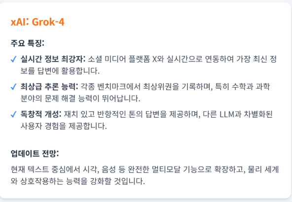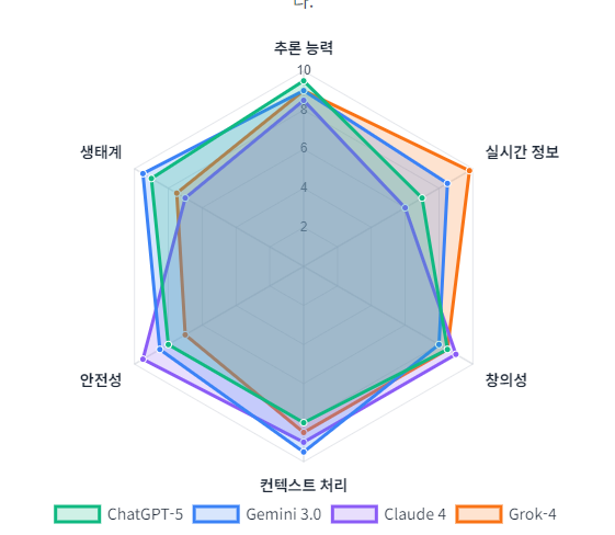 최신 LLM들은 각자의 강점을 바탕으로 다차원적인 경쟁을 펼치고 있습니다. 추론 능력, 실시간 정보 접근성, 창의성, 안전성 등 다양한 지표에서 모델별 특성이 뚜렷하게 나타납니다.