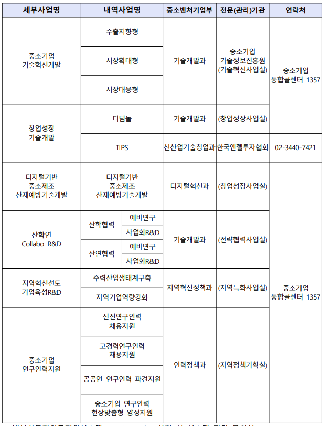 2025년 중기부 정부과제 사업별 문의처 확인하기