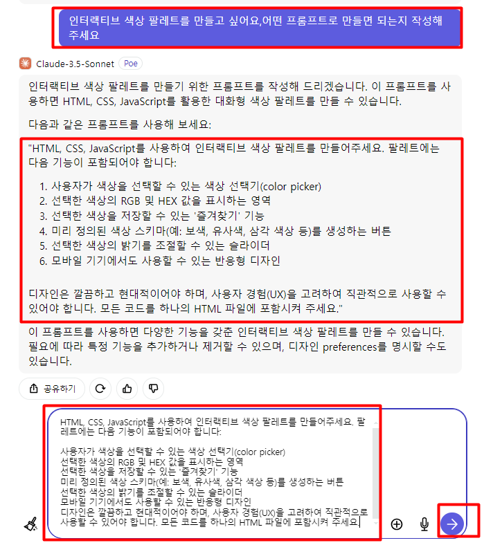 2. 인터랙티브 색상 팔레트를 만들고 싶어요,어떤 프롬프트로 만들면 되는지 작성해주세요