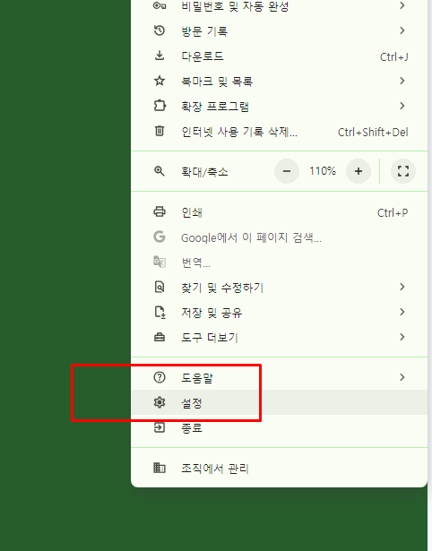 1. 크롬 브라우저 실행 > 오른쪽 상단 점 세개 메뉴창 > “설정” 버튼 선택